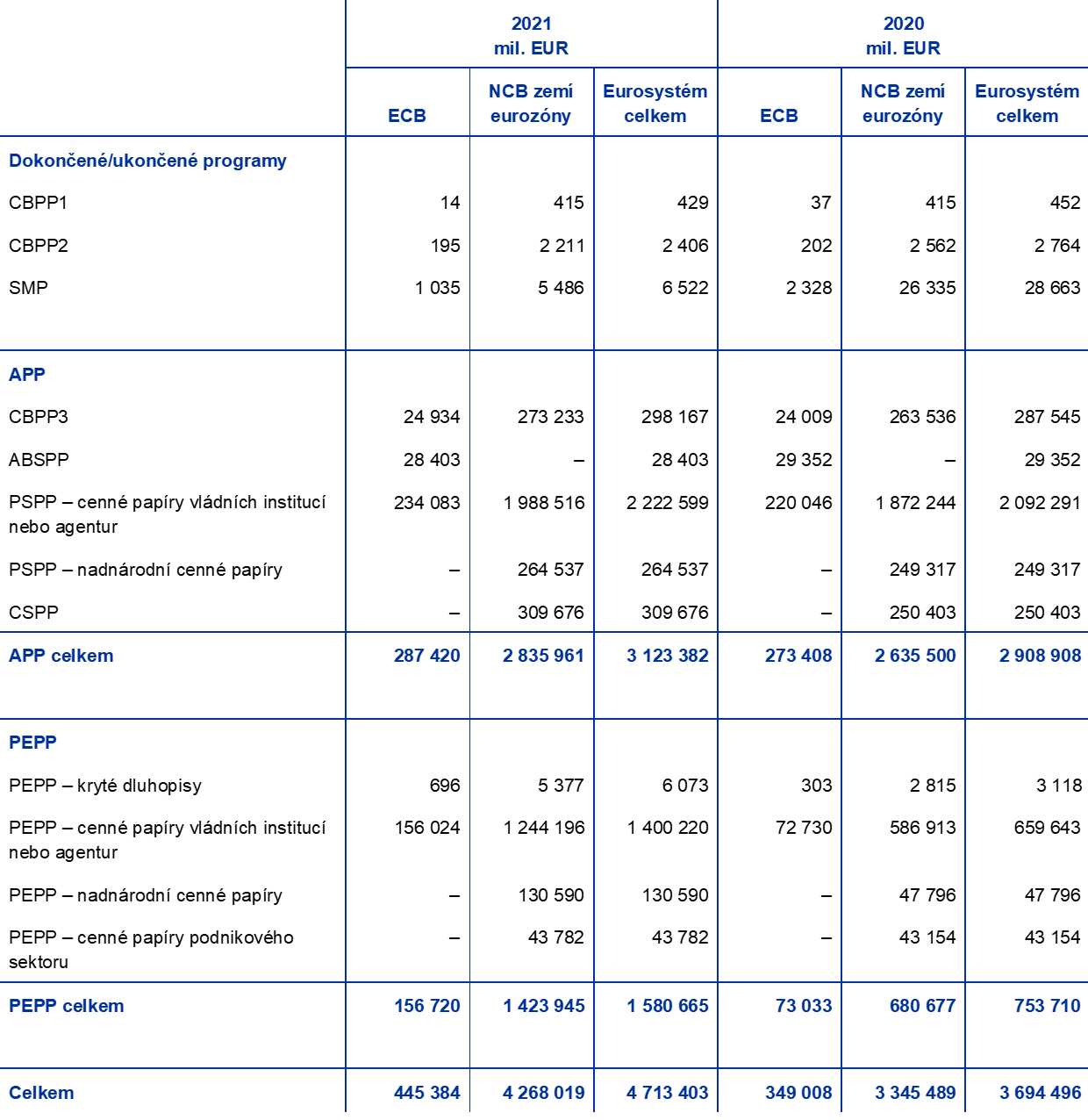 V prosinci 2021 Rada guvernérů oznámila[8], že měsíční objem čistých nákupů v rámci APP zvýší ve druhém čtvrtletí roku 2022 na 40 mld. EUR a ve třetím čtvrtletí na 30 mld. EUR. Počínaje říjnem 2022 budou čisté nákupy aktiv udržovány v měsíčním objemu 20 mld. EUR po dobu nezbytně nutnou k podpoření akomodačního dopadu sazeb měnové politiky ECB a budou ukončeny krátce před tím, než Rada guvernérů zahájí zvyšování základních úrokových sazeb ECB. Rada guvernérů se dále rozhodla ukončit čisté nákupy aktiv v rámci PEPP na konci března 2022. Tyto nákupy by se však mohly v případě potřeby obnovit, aby pomohly čelit negativním šokům spojeným s pandemií. V souladu s rozhodnutím Rady guvernérů bude Eurosystém nadále v plném rozsahu reinvestovat jistiny ze splatných cenných papírů zakoupených v rámci APP a PEPP.