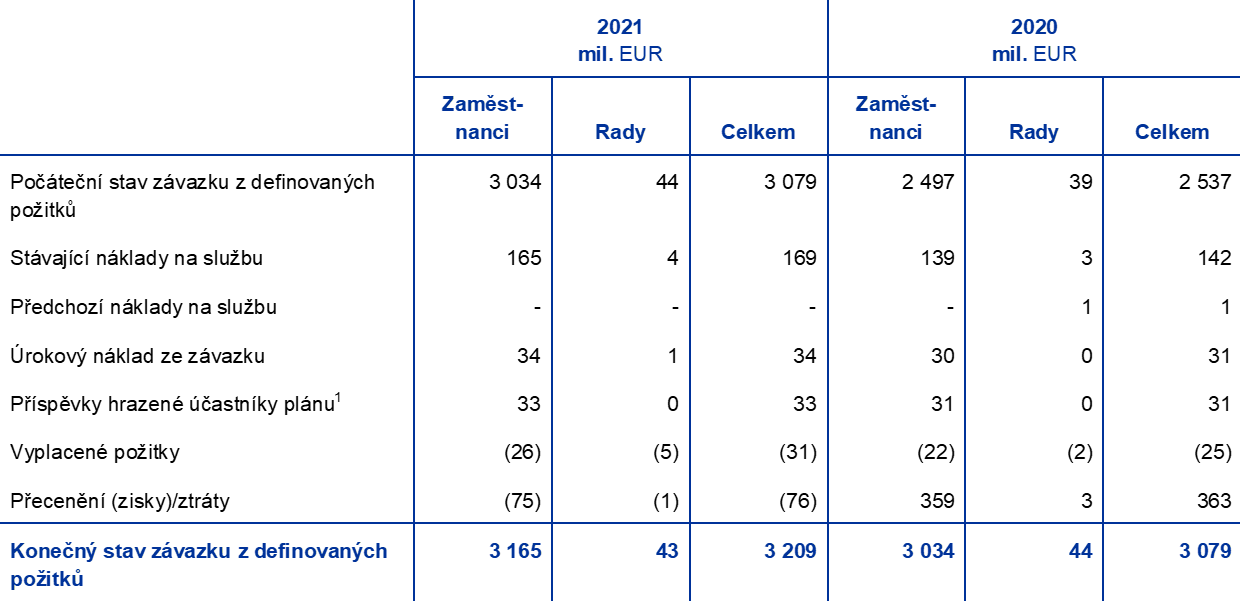 - Pilíř definovaných požitků v plánu odráží pouze povinné příspěvky ECB a jejích zaměstnanců. V roce 2021 činily dobrovolné příspěvky zaměstnanců v rámci pilíře definovaných příspěvků 220 mil. EUR (186 mil. EUR v roce 2020). Tyto příspěvky jsou investovány do aktiv plánu a dávají vzniknout odpovídající povinnosti stejné výše.