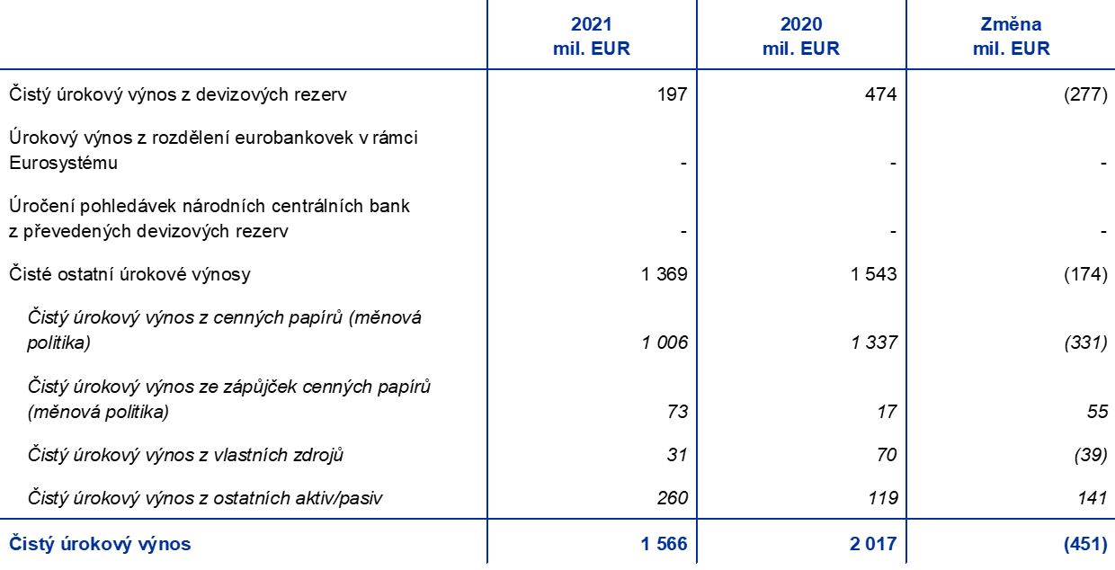 Čistý úrokový výnos ECB poklesl o 451 mil. EUR na 1 566 mil. EUR (graf 14) z důvodu nižšího úrokového výnosu z cenných papírů držených pro účely měnové politiky a z devizových rezerv. Nárůst čistých ostatních úrokových výnosů kompenzoval tyto poklesy jen částečně.