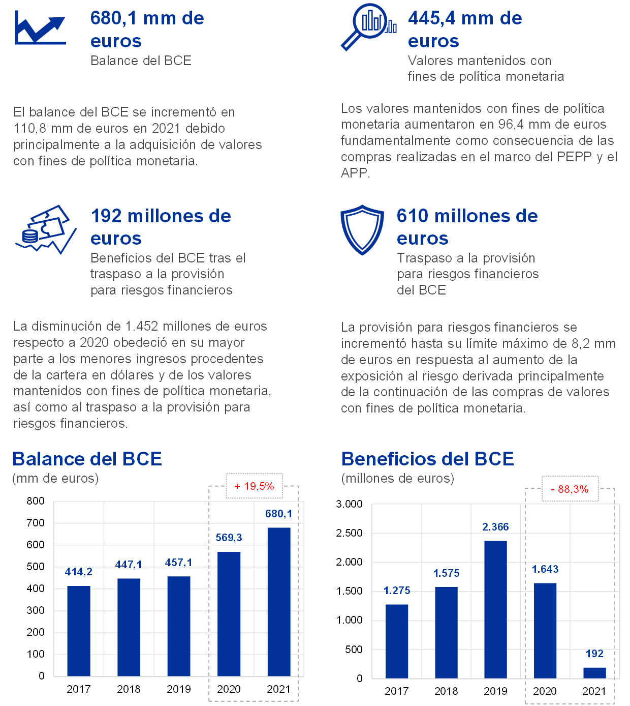 A final de 2021, el valor total de los billetes en circulación ascendía a 1.544,4 mm de euros, lo que supone un incremento del 8 % respecto al final de 2020. Al BCE se le ha asignado una participación del 8 % del valor total de los billetes en euros en circulación, que ascendía a 123,6 mm de euros a final del año. Dado que el BCE no pone los billetes en circulación, mantiene activos intra-Eurosistema frente a los BCN de la zona del euro por un importe equivalente al valor de esos billetes.