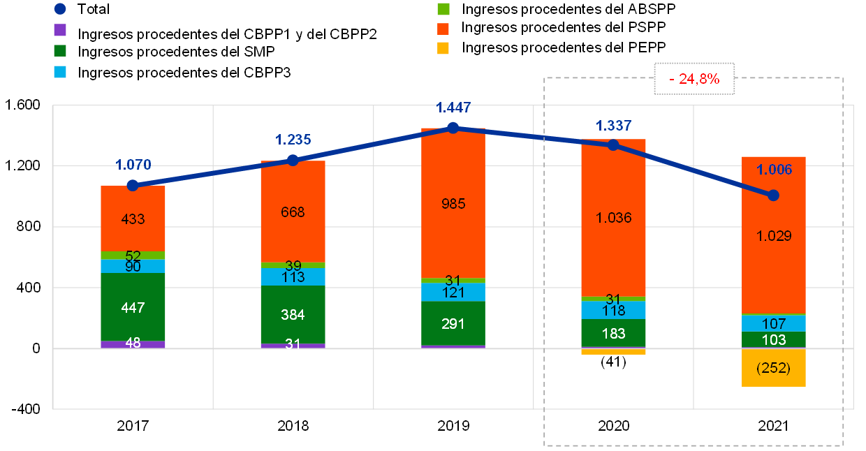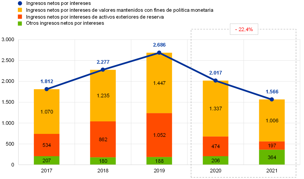 En 2021, los valores adquiridos con fines de política monetaria generaron un 64 % de los ingresos netos por intereses del BCE.