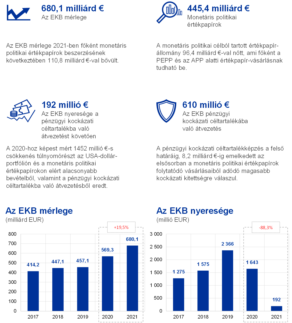 2021-ben az EKB mérlegfőösszege 110,8 milliárd euróval 680,1 milliárd euróra emelkedett, főként a PEPP és az APP keretében végrehajtott értékpapír-vásárlásban való EKB-részesedés miatt. Az említett vásárlások révén a monetáris politikai célú értékpapír-állomány megemelkedett, miközben az eurorendszeren belüli kötelezettségek ennek megfelelően szintén megemelkedtek a vásárlások TARGET2 számlákon keresztüli készpénzes kiegyenlítése nyomán. Az eurorendszerbeli kötelezettségek növekedését bőven ellensúlyozta az EKB euroövezeten kívüli TARGET2 ügyfeleitől kapott készpénz, amely az egyéb kötelezettségek növekedését is maga után vonta.