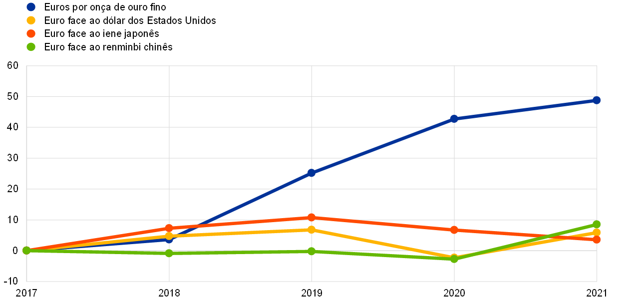 Os ganhos não realizados nas posições em ouro, moeda estrangeira e títulos que são objeto de reavaliação de preços não são reconhecidos como proveitos na conta de resultados, sendo registados diretamente em contas de reavaliação apresentadas no lado do passivo do balanço do BCE. Os saldos destas contas podem ser utilizados para absorver o impacto de qualquer futura oscilação desfavorável dos preços e/ou das taxas de câmbio correspondentes, reforçando, assim, a resiliência do BCE aos riscos subjacentes. Em 2021, as contas de reavaliação das posições em ouro, moeda estrangeira e títulos[13] aumentaram 3,8 mil milhões de euros, passando para 33,1 mil milhões de euros. Tal deveu‑se aos saldos de reavaliação mais elevados das divisas e do ouro, sobretudo em resultado da apreciação do dólar dos Estados Unidos face ao euro (gráfico 12) e da subida do preço de mercado do ouro em euros, o que foi parcialmente compensado pelo decréscimo dos saldos de reavaliação dos títulos.