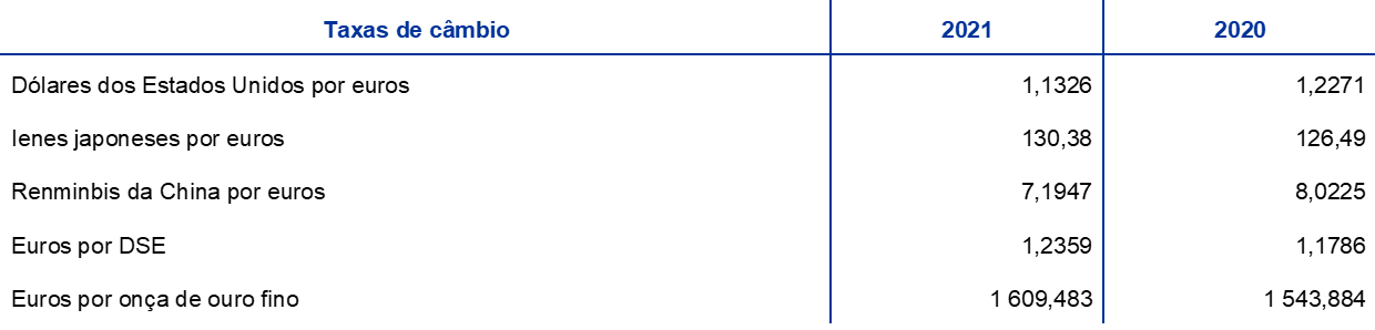 Em 2021, o valor total em euros dos ativos de reserva do BCE – que consistem em ouro, direitos de saque especiais (DSE), dólares dos Estados Unidos (USD), ienes do Japão (JPY) e renminbis da China (CNY) – aumentou 4,5 mil milhões de euros, passando para 80,3 mil milhões de euros.
