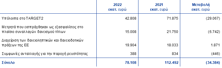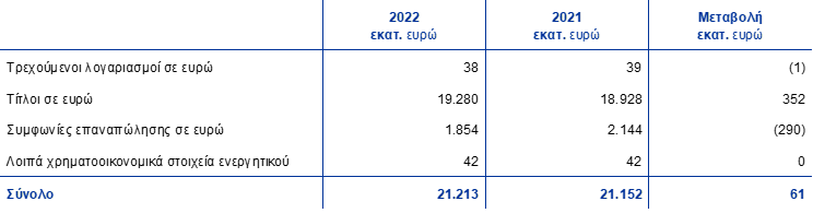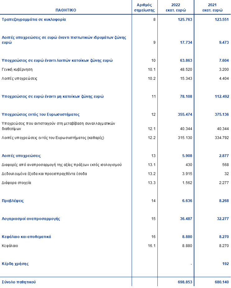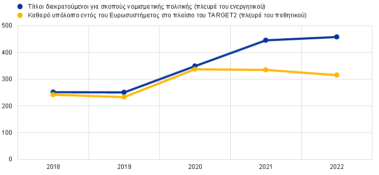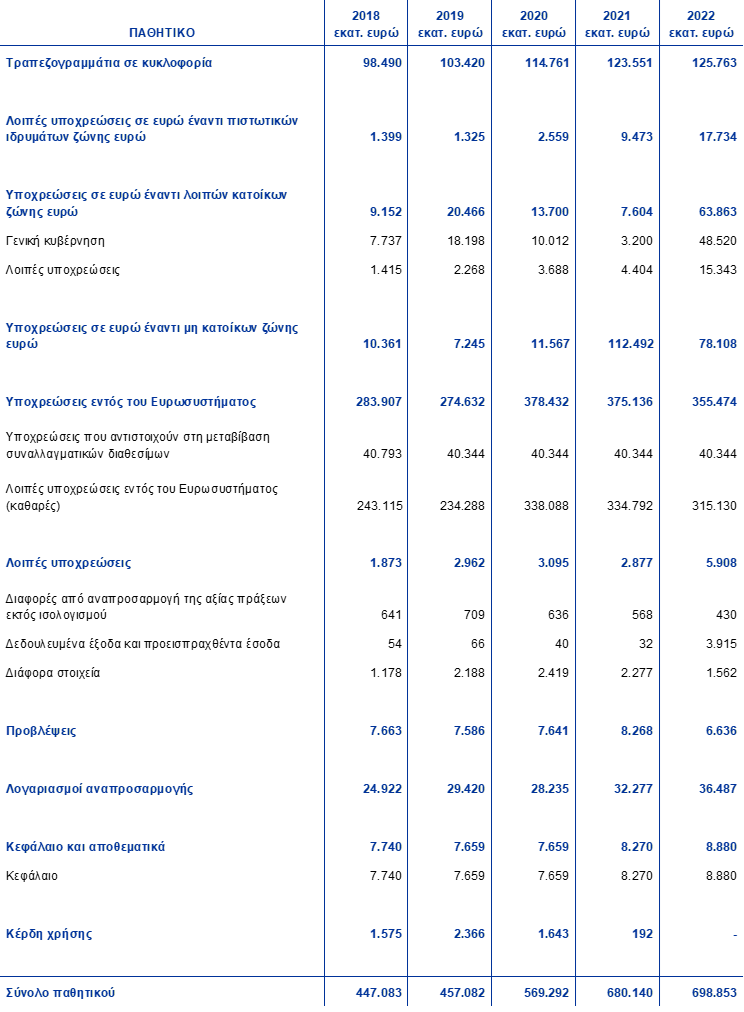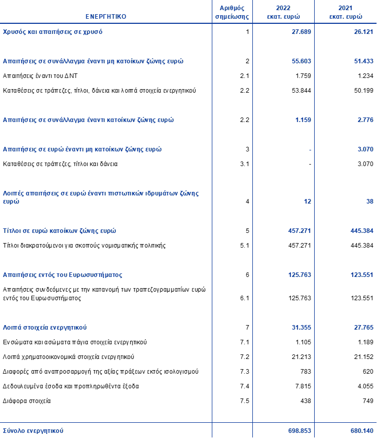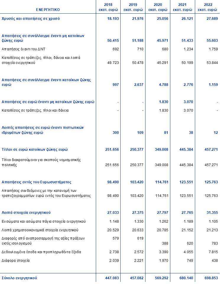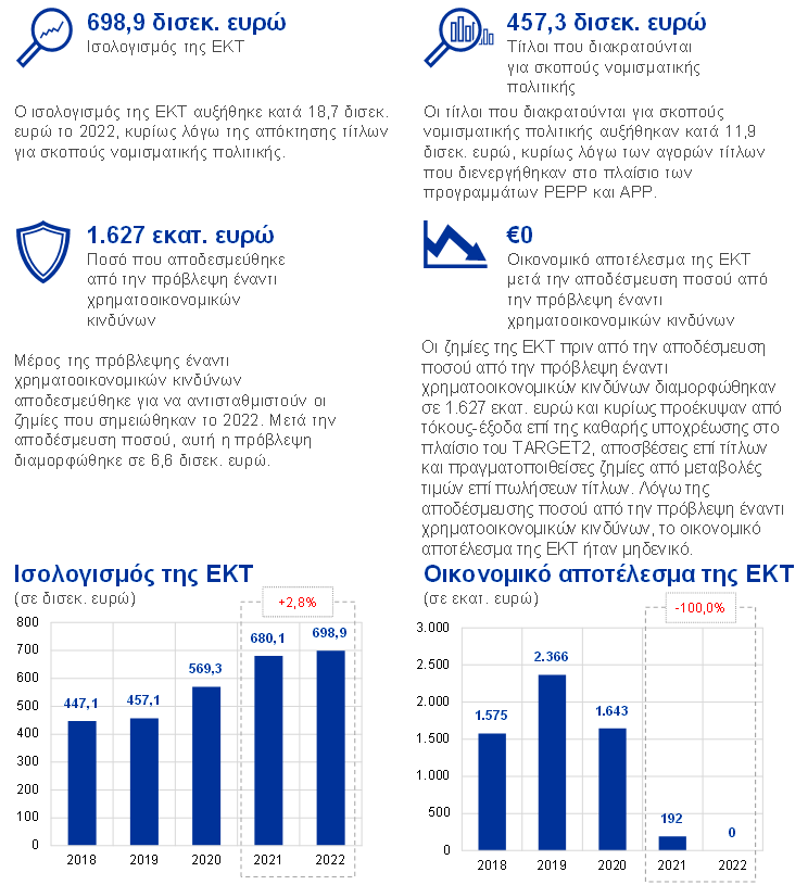 Το 2022 ο ισολογισμός της ΕΚΤ αυξήθηκε κατά 18,7 δισεκ. ευρώ σε 698,9 δισεκ. ευρώ, κυρίως λόγω του μεριδίου της ΕΚΤ όσον αφορά τις αγορές τίτλων που έχουν διενεργηθεί στο πλαίσιο των προγραμμάτων PEPP και APP. Οι αγορές αυτές είχαν ως αποτέλεσμα την αύξηση των τίτλων που διακρατούνται για σκοπούς νομισματικής πολιτικής, ενώ ο διακανονισμός σε μετρητά των εν λόγω αγορών μέσω λογαριασμών στο TARGET2 οδήγησε σε αντίστοιχη αύξηση των υποχρεώσεων εντός του Ευρωσυστήματος. Αυτή η αύξηση των υποχρεώσεων εντός του Ευρωσυστήματος υπεραντισταθμίστηκε από τις εισροές μετρητών λόγω της αύξησης των καταθέσεων που τηρούν κάτοικοι της ζώνης του ευρώ στην ΕΚΤ, με αποτέλεσμα ταυτόχρονη αύξηση των λοιπών υποχρεώσεων.