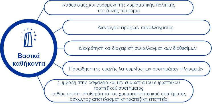Η ΕΚΤ αποτελεί μέρος του Ευρωσυστήματος, το οποίο περιλαμβάνει, εκτός από την ΕΚΤ, τις εθνικές κεντρικές τράπεζες (ΕθνΚΤ) των κρατών μελών της Ευρωπαϊκής Ένωσης (ΕΕ), οι οποίες έχουν ως νόμισμα το ευρώ.[3] Πρωταρχικός σκοπός του Ευρωσυστήματος είναι η διατήρηση της σταθερότητας των τιμών. Η ΕΚΤ εκτελεί τα καθήκοντά της όπως περιγράφονται στη Συνθήκη για τη Λειτουργία της Ευρωπαϊκής Ένωσης[4] και στο Καταστατικό του Ευρωπαϊκού Συστήματος Κεντρικών Τραπεζών και της Ευρωπαϊκής Κεντρικής Τράπεζας (Καταστατικό του ΕΣΚΤ)[5] (Σχήμα 1). Σκοπός της ΕΚΤ κατά την εκτέλεση των δραστηριοτήτων της είναι να εκπληρώνει την εντολή που της έχει ανατεθεί και όχι να παράγει κέρδη.