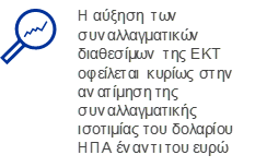 Τα συναλλαγματικά διαθέσιμα της ΕΚΤ[10] σε δολάρια ΗΠΑ, γιεν Ιαπωνίας και γιουάν Κίνας αυξήθηκαν, σε όρους ευρώ, κατά 2,0 δισεκ. ευρώ σε 55,0 δισεκ. ευρώ (Διάγραμμα 5), κυρίως λόγω της ανατίμησης του δολαρίου ΗΠΑ έναντι του ευρώ. Η ανατίμηση του δολαρίου ΗΠΑ αντανακλάται και στην αύξηση των υπολοίπων των λογαριασμών αναπροσαρμογής της ΕΚΤ (βλ. Ενότητα 1.3.2 "Οικονομικοί πόροι").