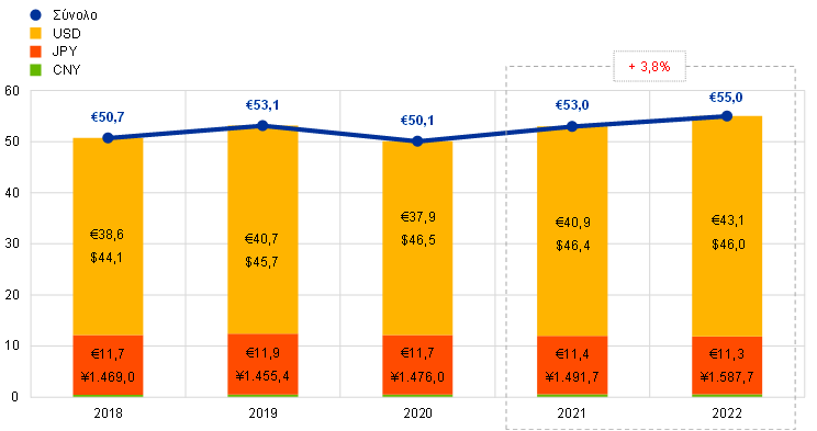 Τα δολάρια ΗΠΑ εξακολουθούν να αποτελούν το βασικό μέρος των συναλλαγματικών διαθεσίμων της ΕΚΤ, αναλογώντας στο 78% περίπου του συνόλου στο τέλος του 2022.