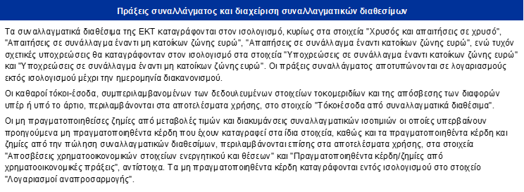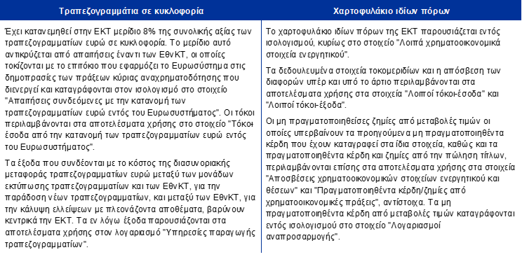 Σημείωση: Οι "Λογαριασμοί αναπροσαρμογής" περιλαμβάνουν τα συνολικά κέρδη από αναπροσαρμογή όσον αφορά τον χρυσό, τα συναλλαγματικά διαθέσιμα και τους διακρατούμενους τίτλους, όχι όμως τους λογαριασμούς αναπροσαρμογής όσον αφορά τις μετεργασιακές παροχές.