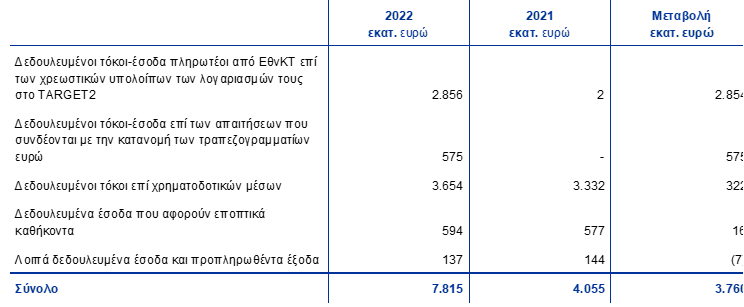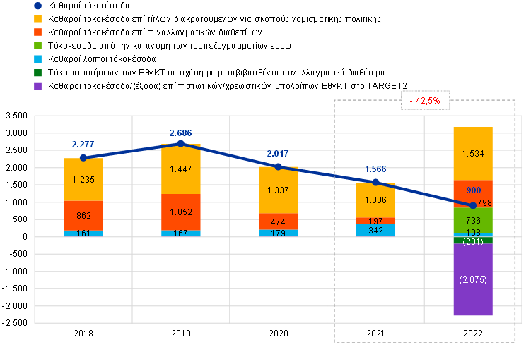 Μετά την αποδέσμευση ποσού ύψους 1.627 εκατ. ευρώ από την πρόβλεψη έναντι χρηματοοικονομικών κινδύνων για την αντιστάθμιση των ζημιών που σημειώθηκαν το 2022, το οικονομικό αποτέλεσμα της ΕΚΤ ήταν μηδενικό (2021: 192 εκατ. ευρώ). Οι ζημίες προήλθαν κυρίως από i) τους τόκους-έξοδα επί της καθαρής υποχρέωσης της ΕΚΤ στο πλαίσιο του TARGET2 και (β) το αρνητικό καθαρό αποτέλεσμα από χρηματοοικονομικές πράξεις και αποσβέσεις (Διάγραμμα 13).