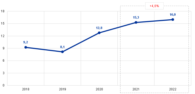 Στο τέλος του 2022, η συνολική αξία των τραπεζογραμματίων ευρώ σε κυκλοφορία ήταν 1.572,0 δισεκ. ευρώ, δηλ. αυξήθηκε κατά 1,8% σε σχέση με το τέλος του 2021. Στην ΕΚΤ έχει κατανεμηθεί μερίδιο 8% επί της συνολικής αξίας των τραπεζογραμματίων ευρώ σε κυκλοφορία, το οποίο αντιστοιχούσε σε 125,8 δισεκ. ευρώ στο τέλος του έτους. Δεδομένου ότι η ΕΚΤ δεν εκδίδει η ίδια τραπεζογραμμάτια, διακρατεί απαιτήσεις εντός του Ευρωσυστήματος έναντι των ΕθνΚΤ της ζώνης του ευρώ αξίας ισόποσης της αξίας των τραπεζογραμματίων ευρώ σε κυκλοφορία.