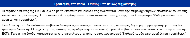Οι δαπάνες της ΕΚΤ κατά την άσκηση των εποπτικών της καθηκόντων ανακτώνται μέσω της επιβολής ετήσιων τελών στις εποπτευόμενες οντότητες. Περισσότερες λεπτομέρειες διατίθενται στον δικτυακό τόπο της ΕΚΤ για την τραπεζική εποπτεία.
