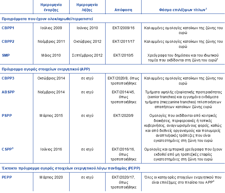 Το πρόγραμμα APP αποτελείται από το τρίτο πρόγραμμα αγοράς καλυμμένων ομολογιών (third covered bond purchase programme – CBPP3), το πρόγραμμα αγοράς τιτλοποιημένων απαιτήσεων (asset-backed securities purchase programme – ABSPP), το πρόγραμμα αγοράς τίτλων του δημόσιου τομέα (public sector purchase programme – PSPP) και το πρόγραμμα αγοράς ομολόγων του επιχειρηματικού τομέα (corporate sector purchase programme – CSPP). Η ΕΚΤ δεν αποκτά τίτλους στο πλαίσιο του προγράμματος CSPP. Περισσότερες λεπτομέρειες σχετικά με το πρόγραμμα APP διατίθενται στον δικτυακό τόπο της ΕΚΤ.