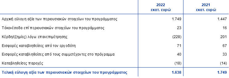 Ο πυλώνας καθορισμένων παροχών του προγράμματος αντικατοπτρίζει μόνο τις υποχρεωτικές εισφορές που καταβάλλουν η ΕΚΤ και τα μέλη του προσωπικού. Επιπλέον, οι εθελούσιες εισφορές μελών του προσωπικού σε πυλώνα καθορισμένων εισφορών το 2022 ανήλθαν σε 189 εκατ. ευρώ (2021: 220 εκατ. ευρώ). Οι εν λόγω εισφορές επενδύονται σε περιουσιακά στοιχεία του προγράμματος και δημιουργούν αντίστοιχη ισόποση δέσμευση.