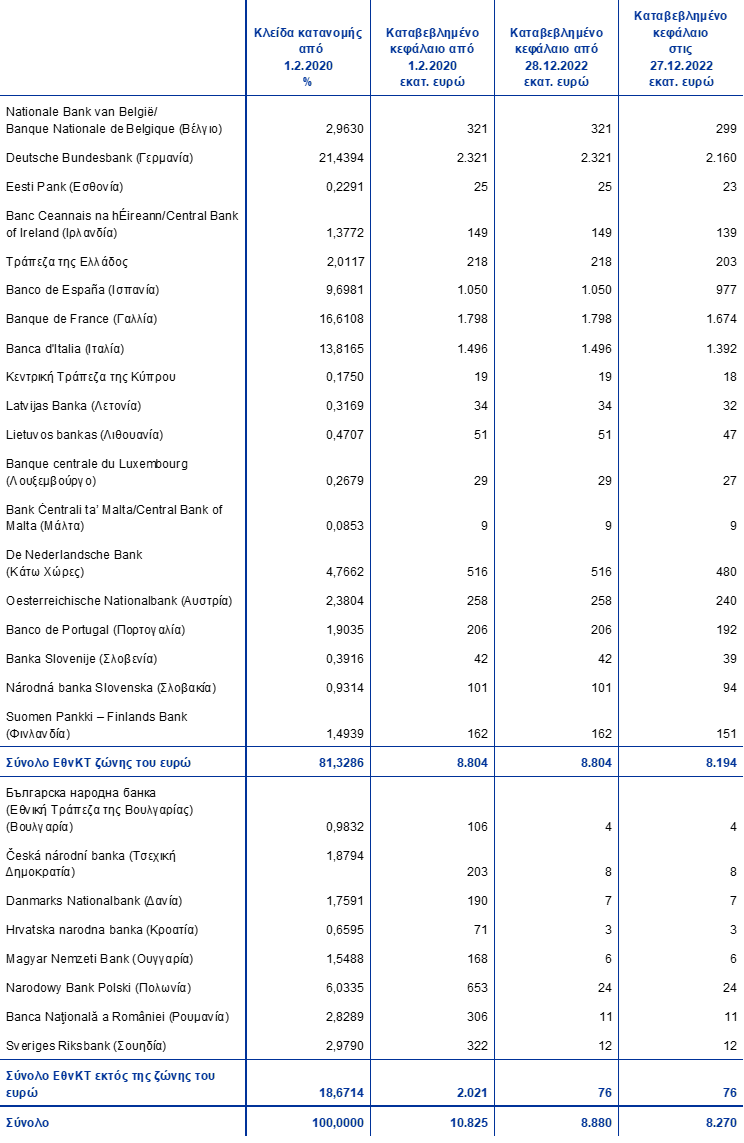 Μετά την αποχώρηση της Bank of England από το ΕΣΚΤ το 2020, τα μερίδια συμμετοχής των υπόλοιπων ΕθνΚΤ στο εγγεγραμμένο κεφάλαιο της ΕΚΤ αυξήθηκαν. Το Διοικητικό Συμβούλιο αποφάσισε ότι οι εναπομένουσες ΕθνΚΤ θα κάλυπταν μόνο το αποσυρθέν καταβεβλημένο κεφάλαιο της Bank of England ύψους 58 εκατ. ευρώ το 2020 και ότι οι ΕθνΚΤ της ζώνης του ευρώ θα κατέβαλαν στο ακέραιο τις αυξημένες εισφορές τους σε δύο ισόποσες ετήσιες δόσεις το 2021 και το 2022. Μετά την καταβολή της τελευταίας δόσης από τις ΕθνΚΤ της ζώνης του ευρώ, το καταβεβλημένο κεφάλαιο της ΕΚΤ αυξήθηκε κατά 0,6 δισεκ. ευρώ σε 8,9 δισεκ. ευρώ το 2022.[15]