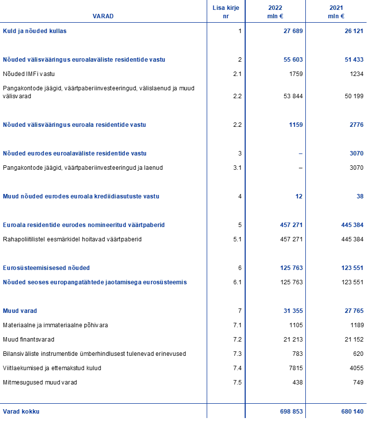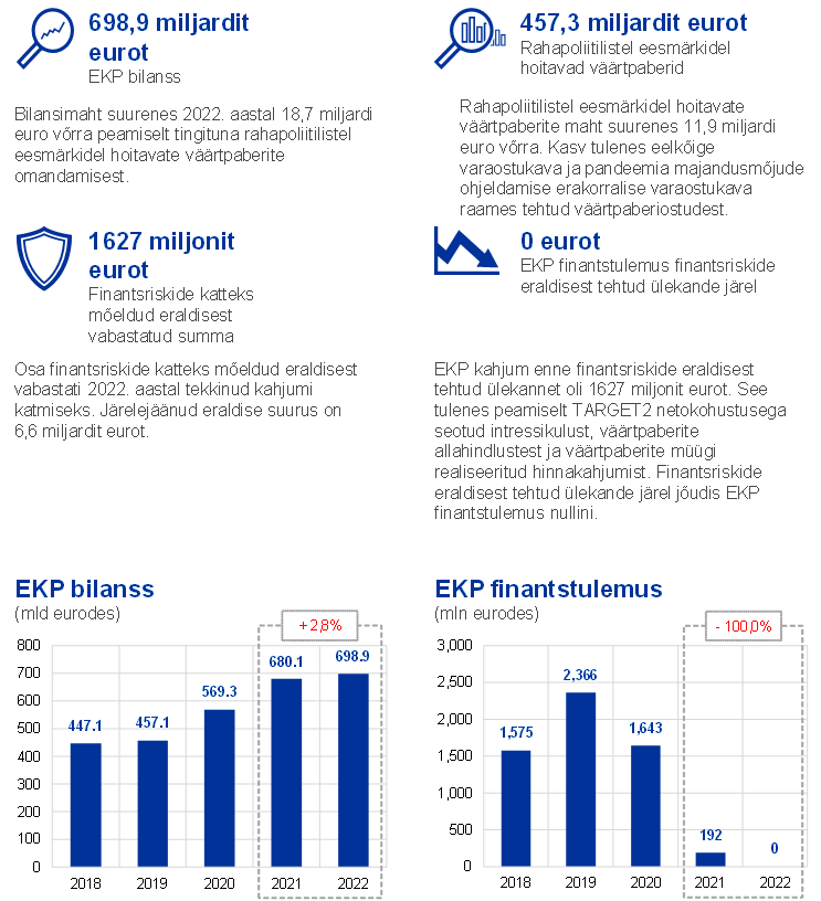2022. aastal suurenes EKP bilanss 18,7 miljardi euro võrra 698,9 miljardi euroni, seda peamiselt seoses EKP osaga varaostukava ja pandeemia majandusmõjude ohjeldamise erakorralise varaostukava raames tehtud väärtpaberiostudest. Ostude tulemusel kasvas rahapoliitilistel eesmärkidel hoitavate väärtpaberite kirje maht, samal ajal kui nende ostude sularahaarveldused TARGET2 kaudu tõid kaasa eurosüsteemisiseste kohustuste sama suure kasvu. Eurosüsteemisiseste kohustuste kasvu korvasid täielikult euroala residentide poolt EKPsse paigutatud suurematest hoiustest tulenenud rahavood, mille tulemusel suurenesid samal ajal ka muud kohustused.