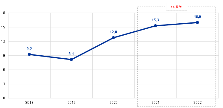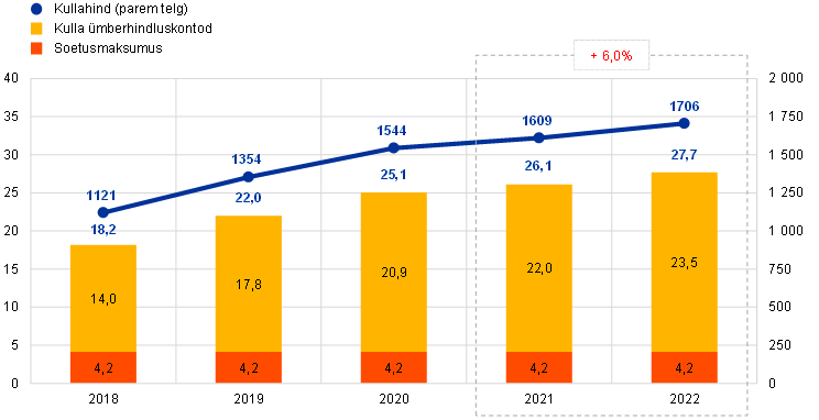 EKP kullavarude ja kullaga seotud nõuete väärtus eurodes kasvas 2022. aastal 1,6 miljardi euro võrra 27,7 miljardi euroni (vt joonis 4) seoses kulla turuhinna tõusuga eurodes. Samal ajal püsis nende varade suurus kullauntsides muutumatuna. Kõnealuste varade väärtuse kasv tõi kaasa ka EKP kulla ümberhindluskontode mahu suurenemise samas ulatuses (vt jagu 1.3.2 „Finantsvahendid”).
