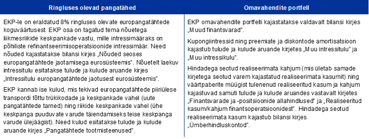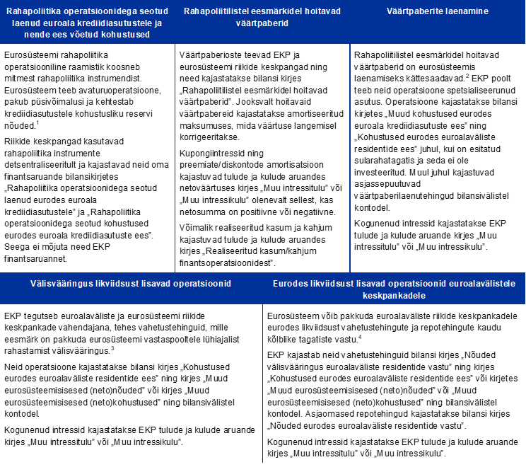 Eurosüsteemi rahapoliitilisi operatsioone kajastatakse EKP finantsaruandes ja euroala riikide keskpankade finantsaruannetes. See väljendab eurosüsteemi rahapoliitika detsentraliseeritud rakendamise põhimõtet. Tabel 1 annab ülevaate EKP ülesannete täitmiseks vajalikest põhitegevustest ja -funktsioonidest ning nende mõjust keskpanga finantsaruandele.