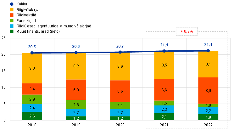 Aastatel 2018–2022 suurenes EKP bilansimaht märkimisväärselt. See oli peamiselt tingitud EKP poolt tehtud väärtpaberite otseostudest eurosüsteemi rahapoliitika rakendamise kontekstis (vt joonis 1). Kuna varaostukava raames (APP)[6] netoostude tegemine lõpetati 2018. aasta detsembris ja seda jätkati taas 2019. aasta novembris, oli bilansimahu kasv 2019. aastal mõõdukas ning tulenes peamiselt EKP välisvaluutareservide turuväärtuse ja ringluses olevate europangatähtede väärtuse tõusust. Bilansimahu märkimisväärset kasvu 2020. ja 2021. aastal soodustasid peamiselt varaostukava raames tehtud väärtpaberite netoostud ja pandeemia majandusmõjude ohjeldamise erakorralise varaostukava (PEPP)[7] käivitamine 2020. aasta märtsis. Väärtpaberite netoostud PEPPi ja APP raames lõpetati vastavalt 2022. aasta märtsi lõpus ja 1. juulil 2022, mistõttu EKP bilansimaht suurenes 2022. aastal mõõdukamalt.