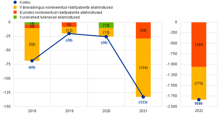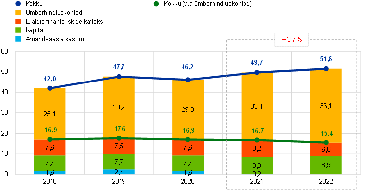 2018.–2020. aastal kujundasid EKP eurosüsteemisiseste kohustuste arengut peamiselt suundumused TARGET2ga seotud netokohustustes tingituna EKP tehtud rahapoliitilistel eesmärkidel hoitavate väärtpaberite netoostudest, mis arveldatakse TARGET2 kontode kaudu (vt joonis 10). 2021. ja 2022. aastal tasakaalustasid rahapoliitilistel eesmärkidel tehtud väärtpaberiostude mõju TARGET2ga seotud netokohustusele täielikult muud tegurid. 2022. aastal olid nendeks peamiselt EKP kui fiskaalagendi[13] poolt vastu võetud euroala residentide hoiuste kasv ning TARGET2-EKP kaudu TARGET2ga ühendatud euroala kõrvalsüsteemide suuremad saldod.