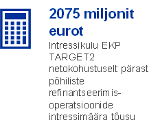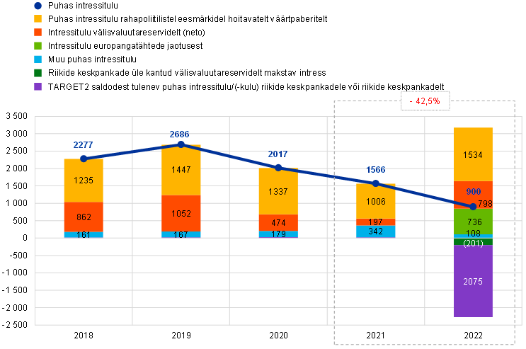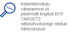 EKP puhas intressitulu vähenes 666 miljoni euro võrra 900 miljoni euroni (joonis 14) peamiselt EKP TARGET2 netokohustustega seotud intressikulu tõttu. Vähenemisele aitas kaasa ka intressikulu EKP-le üle kantud euroala riikide keskpankade välisvaluutareservidega seotud nõuetelt. Osaliselt korvas neid kulusid suurem intressitulu, mis saadi i) EKP nõuetelt seoses europangatähtede jaotamisega eurosüsteemis; ii) välisvaluutareservidelt ja iii) rahapoliitilistel eesmärkidel hoitavatelt väärtpaberitelt.