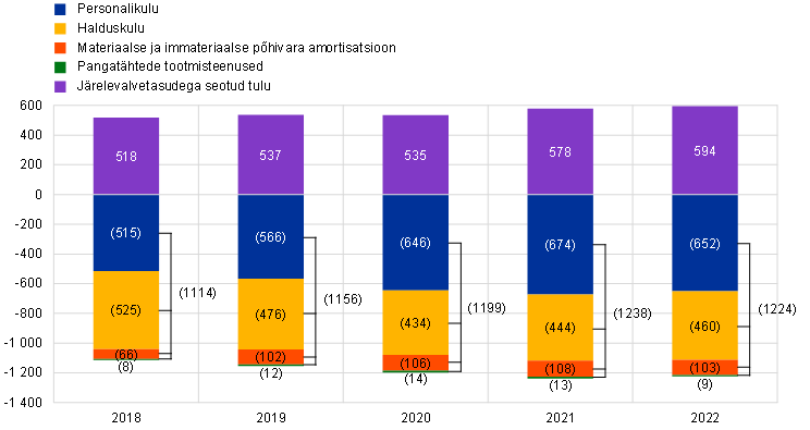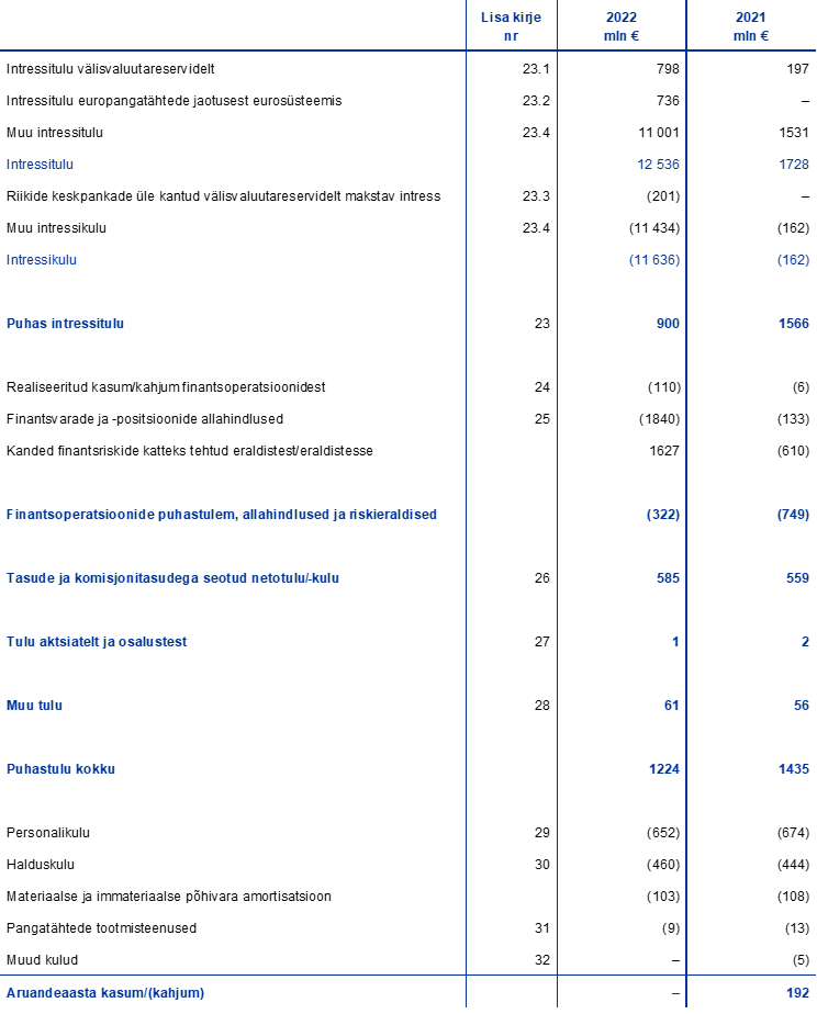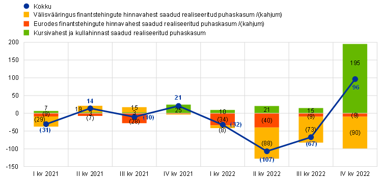 Pärast finantsriskide katteks mõeldud eraldisest tehtud 1627 miljoni euro suurust ülekannet 2022. aastal tekkinud kahjumi katmiseks oli EKP finantstulemus null (2021. aastal oli see 192 miljonit eurot). Kahjum oli peamiselt tingitud i) EKP TARGET2 netokohustuselt tekkinud intressikulust ning ii) finantsoperatsioonide ja finantsvarade allahindluste negatiivsest netotulemist (vt joonis 13).