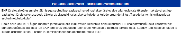 EKP järelevalveülesannete täitmisega seotud kulud kaetakse järelevalve alla kuuluvate üksuste makstavatest iga-aastastest järelevalvetasudest. Lisateavet saab EKP pangandusjärelevalve veebilehelt.