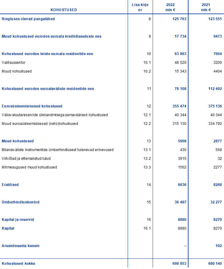 EKP eurosüsteemisisesed kohustused koosnevad peamiselt euroala riikide keskpankade TARGET2 netosaldodest EKP suhtes ja EKP kohustustest seoses eurosüsteemiga liitunud euroala riikide keskpankade üle kantud välisvaluutareservidega. Need kohustused vähenesid 2022. aastal 19,7 miljardi euro võrra 355,5 miljardi euroni.
