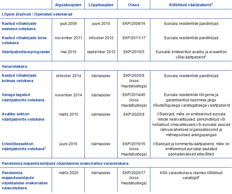Varaostukava (APP) hõlmab kaetud võlakirjade kolmandat ostukava (CBPP3), varaga tagatud väärtpaberite ostukava (ABSPP), avaliku sektori väärtpaberite ostukava (PSPP) ja ettevõtlussektori väärtpaberite ostukava (CSPP). EKP ei omanda väärtpabereid ettevõtlussektori väärtpaberite ostukava raames. Lisateavet varaostukava kohta saab EKP veebilehelt.