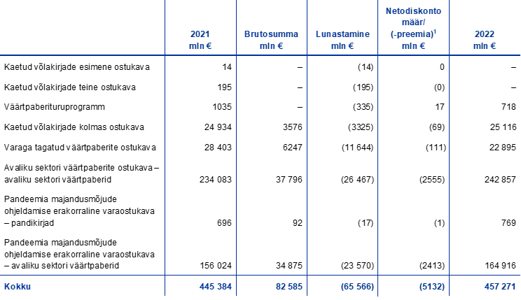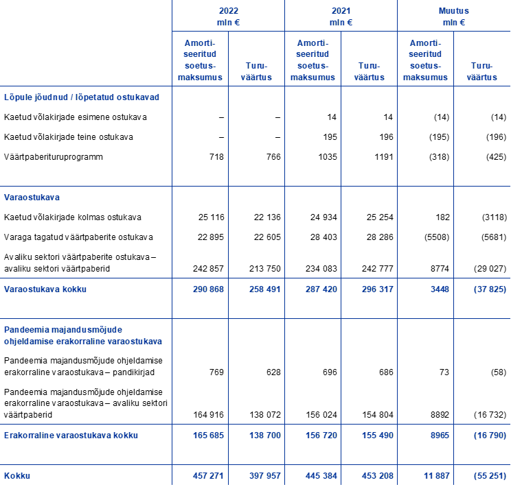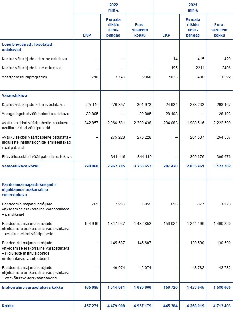EKP nõukogu asjaomaste otsuste alusel jätkas EKP väärtpaberite netovaraoste pandeemia majandusmõjude ohjeldamise erakorralise varaostukava raames kuni 2022. aasta märtsi lõpuni. Netovaraostud varaostukava raames lõpetati 1. juulil 2022. Samal ajal jätkati 2002. aastal mõlema portfelli raames ostetud aegumistähtajani jõudnud väärtpaberitelt laekunud põhiosa tagasimaksete reinvesteerimist täies ulatuses. Nende ostude ja reinvesteeringute tulemusel kasvas EKP poolt rahapoliitilistel eesmärkidel hoitavate väärtpaberite portfelli maht 11,9 miljardi euro võrra 457,3 miljardi euroni (vt joonis 2), sealjuures suurenes pandeemia majandusmõjude ohjeldamise erakorralise varaostukava ja avaliku sektori väärtpaberite ostukava varade maht vastavalt 9,0 miljardi ja 8,8 miljardi euro võrra. Varaga tagatud võlakirjade ostukava varade maht vähenes 5,5 miljardi euro võrra tingituna väärtpaberite lunastamistest.