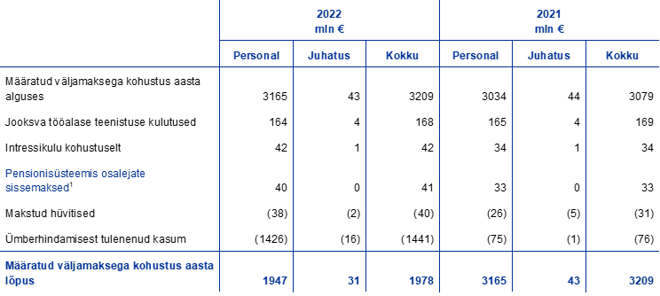 Need pensionidega seotud maksed vähendasid bilansis kajastatud määratud väljamaksega kohustust. EKP juhatuse ja järelevalvenõukogu praeguste liikmete pensionidega seotud netosumma kohta, mis kajastub tulude ja kulude aruandes, vt lisa kirje 13.3 „Mitmesugused muud kohustused”.