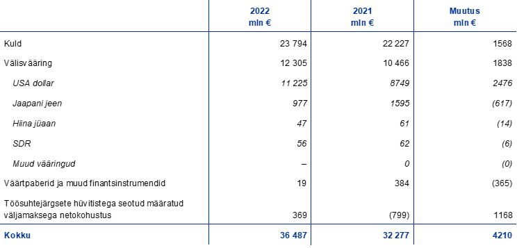 2022. aastal suurenes EKP välisvaluutareservide koguväärtus eurodes 4,1 miljardi euro võrra 84,5 miljardi euroni. Välisvaluutareservide portfelli moodustavad kuld, Rahvusvahelise Valuutafondi arvestusühikud, USA dollarid, Jaapani jeenid ning Hiina jüaanid.
