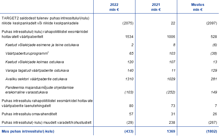 Rahapoliitilistel eesmärkidel hoitavatelt väärtpaberitelt saadud puhas intressitulu suurenes 2022. aastal 528 miljoni euro võrra 1534 miljoni euroni (vt joonis 15). Selle peamisteks põhjusteks olid suurem puhas intressitulu seoses varaostukavaga (kaetud võlakirjade kolmanda ostukava (CBPP3), varaga tagatud väärtpaberite ostukava (ABSPP) ja avaliku sektori väärtpaberite ostukava (PSPP)) ning väiksem negatiivne puhas intressitulu seoses PEPP portfelliga. Varaostukavast saadud puhas intressitulu suurenes 2022. aastal 424 miljoni euro võrra 1571 miljoni euroni ning PEPPi portfelli negatiivne puhas intressitulu vähenes 103 miljoni euroni võrreldes 252 miljoni euroga 2021. aastal. Selle peamiseks põhjuseks oli euroala võlakirjade tulususe märkimisväärne tõus 2022. aastal (vt joonis 16), mis võimaldas osta mõlema kava raames väärtpabereid vastavate portfellide varasemate aastate tootlusega võrreldes kõrgema tulususega. Väärtpaberituruprogrammi ning kaetud võlakirjade esimese ja teise ostukava portfellidelt teenitud puhas intressitulu vähenes 45 miljoni euro võrra 66 miljoni euroni seoses nende portfellide mahu kahanemisega väärtpaberite lunastustähtaegade saabumise tulemusel.