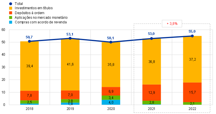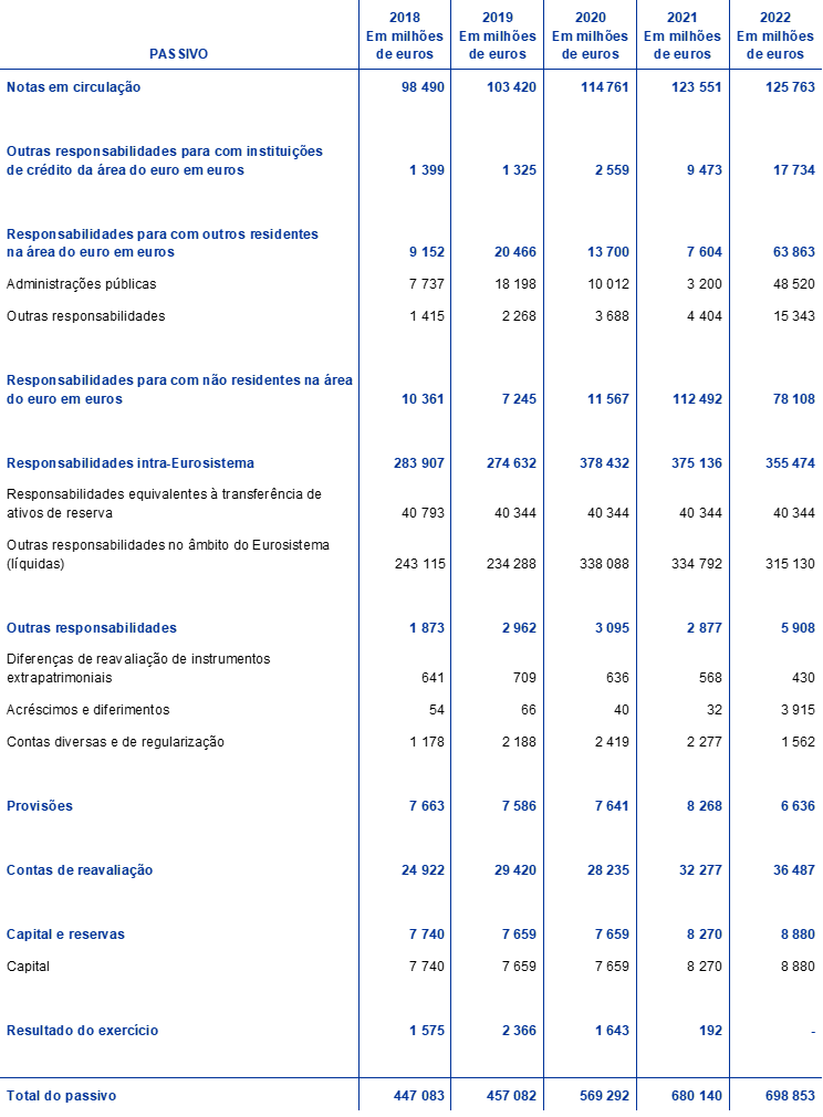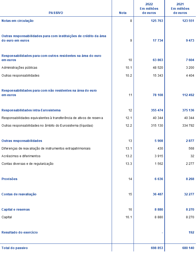 Em 2022, o balanço do BCE aumentou 18,7 mil milhões de euros, passando para 698,9 mil milhões de euros, devido sobretudo à quota do BCE nas aquisições de títulos ao abrigo do PEPP e do APP. Essas aquisições resultaram num aumento dos títulos detidos para fins de política monetária, tendo a liquidação em numerário das mesmas, através de contas no TARGET2, levado a um aumento correspondente das responsabilidades intra‑Eurosistema. Este aumento das responsabilidades intra‑Eurosistema foi mais do que compensado por entradas de caixa, em resultado de um volume mais elevado de depósitos de residentes na área do euro junto do BCE, o que resultou simultaneamente num aumento da rubrica “Outras responsabilidades”.