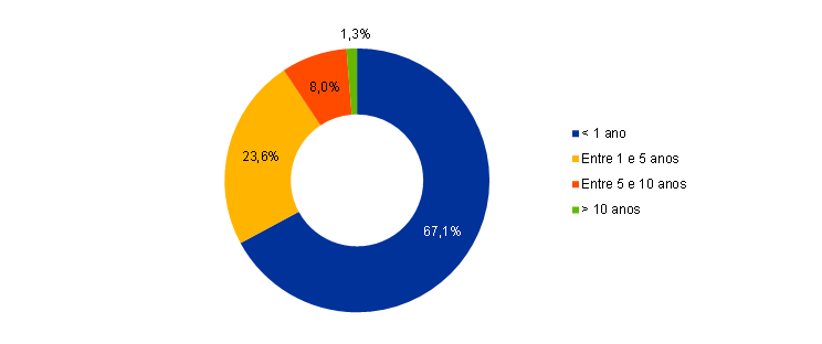 A carteira de fundos próprios do BCE consiste predominantemente nos investimentos dos recursos financeiros do BCE, ou seja, do seu capital realizado e dos montantes afetados ao fundo de reserva geral e à provisão para riscos financeiros. Esta carteira destina‑se a proporcionar rendimentos que ajudem o BCE a financiar as suas despesas operacionais não relacionadas com o desempenho das atribuições de supervisão[12]. É investida em ativos denominados em euros, sob reserva dos limites impostos pelo quadro de controlo do risco da mesma, o que resulta numa estrutura de maturidades mais diversificada (gráfico 9) do que a da carteira de ativos de reserva.