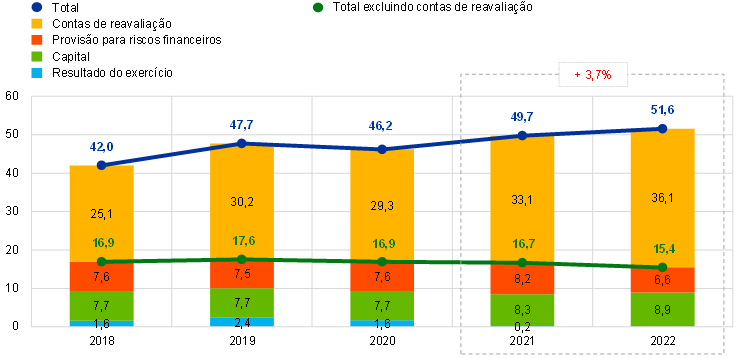 Os recursos financeiros do BCE compreendem o seu capital, os montantes detidos na provisão para riscos financeiros e no fundo de reserva geral, as contas de reavaliação e os eventuais lucros do exercício. São i) investidos em ativos que geram rendimento e/ou ii) utilizados para compensar perdas. Em 31 de dezembro de 2022, os recursos financeiros do BCE totalizavam 51,6 mil milhões de euros (gráfico 11). Este montante era 1,8 mil milhões de euros mais elevado do que em 2021, devido i) ao aumento das contas de reavaliação em resultado da apreciação do dólar dos Estados Unidos face ao euro e da subida do preço de mercado do ouro em euros em 2022; e ii) ao aumento do capital realizado. Estes aumentos foram parcialmente compensados, sobretudo pela redução da provisão para riscos financeiros, na sequência da sua utilização parcial para compensar perdas incorridas em 2022.