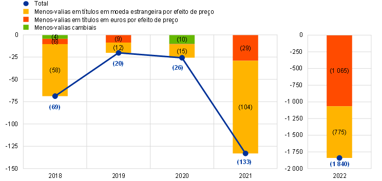 O valor da carteira de fundos próprios manteve‑se praticamente inalterado em 21,1 mil milhões de euros (gráfico 8), dado que, em grande medida, os seus principais fatores impulsionadores em 2022 se compensavam mutuamente. O investimento de um montante total igual ao transferido para a provisão para riscos financeiros do BCE em 2021 e ao realizado pelos BCN dos países da área do euro em 2022 relativo à segunda prestação das respetivas subscrições acrescidas do capital do BCE, na sequência da retirada do banco central do Reino Unido, o Bank of England, do Sistema Europeu de Bancos Centrais (SEBC) (ver a secção 1.3.2, “Recursos financeiros”), aumentou a dimensão da carteira de fundos próprios. Contudo, este aumento foi quase totalmente compensado pela descida do valor de mercado dos títulos detidos nesta carteira, em resultado da subida significativa das taxas de rendibilidade das obrigações da área do euro (gráfico 16).