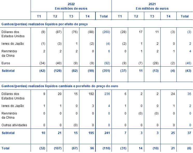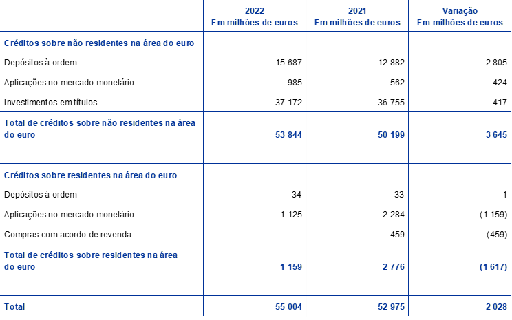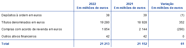 Em 2022, o valor total em euros dos ativos de reserva do BCE – que consistem em ouro, direitos de saque especiais, dólares dos Estados Unidos, ienes do Japão e renminbis da China – aumentou 4,1 mil milhões de euros, passando para 84,5 mil milhões de euros.