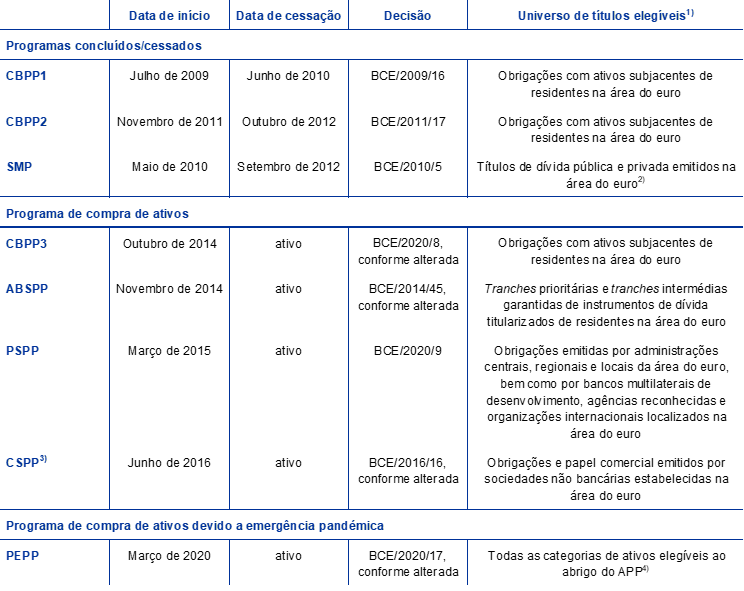 O APP consiste no terceiro programa de compra de obrigações com ativos subjacentes (third covered bond purchase programme – CBPP3), no programa de compra de instrumentos de dívida titularizados (asset‑backed securities purchase programme – ABSPP), no programa de compra de ativos do setor público (public sector purchase programme – PSPP) e no programa de compra de ativos do setor empresarial (corporate sector purchase programme – CSPP). O BCE não adquire títulos ao abrigo do CSPP. São disponibilizados mais pormenores sobre o APP no sítio do BCE.