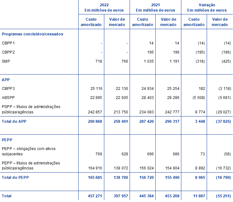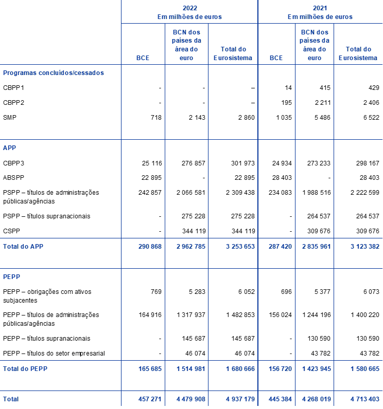 Os títulos detidos para fins de política monetária denominados em euros representavam 65% do total do ativo do BCE no final de 2022. Sob esta rubrica do balanço, o BCE detém títulos adquiridos no quadro do programa dos mercados de títulos de dívida (securities markets programme – SMP), do CBPP3, do ABSPP, do PSPP e do PEPP. Os restantes títulos detidos ao abrigo do primeiro e do segundo programas de compra de obrigações com ativos subjacentes (CBPP1 e CBPP2) venceram no decurso de 2022.