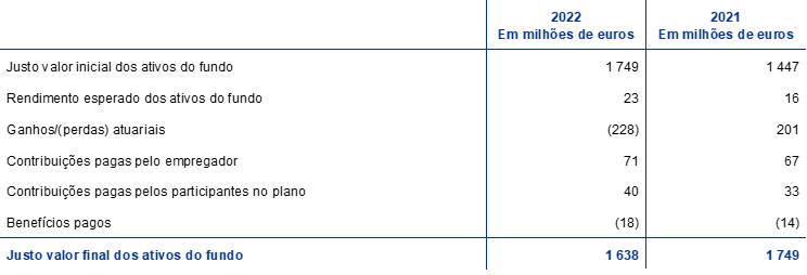 O pilar de benefícios definidos do plano reflete apenas as contribuições obrigatórias do BCE e dos membros do pessoal. As contribuições voluntárias dos membros do pessoal num pilar de contribuições definidas em 2022 cifraram‑se em 189 milhões de euros (220 milhões de euros, em 2021). Essas contribuições são investidas nos ativos do fundo e originam uma responsabilidade correspondente de valor igual.