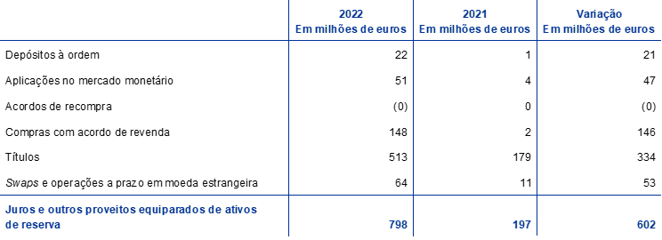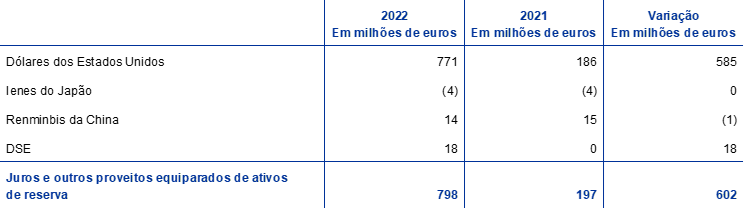 Os juros e outros proveitos equiparados dos ativos de reserva aumentaram 602 milhões de euros, passando para 798 milhões de euros, principalmente em resultado dos juros e outros proveitos equiparados mais elevados dos títulos denominados em dólares dos Estados Unidos. A taxa de juro média auferida na carteira do BCE de ativos denominados em dólares dos Estados Unidos aumentou em 2022, em comparação com o ano anterior, devido a i) vendas e reembolsos de obrigações com taxas de rendibilidade mais baixas adquiridas no passado; e ii) aquisições de títulos com taxas de rendibilidade mais elevadas, devido ao aumento das taxas de rendibilidade das obrigações denominadas em dólares dos Estados Unidos desde o final de 2021 (gráfico 17).