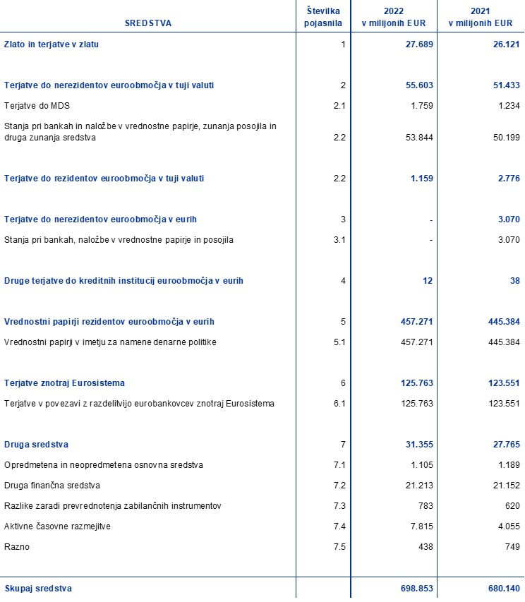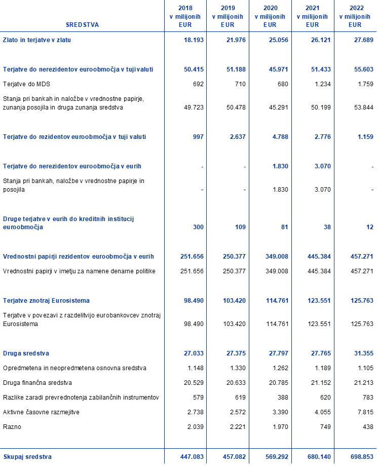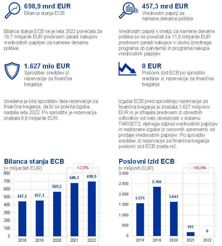 V letu 2022 se je bilanca stanja ECB povečala za 18,7 milijarde EUR na 698,9 milijarde EUR, in sicer predvsem zaradi deleža ECB od vrednostnih papirjev, kupljenih v okviru izrednega programa nakupa vrednostnih papirjev ob pandemiji in programa nakupa vrednostnih papirjev. Ti nakupi so povzročili povečanje vrednostnih papirjev v imetju za namene denarne politike, medtem ko je denarna poravnava teh nakupov prek sistema TARGET2 privedla do enakovrednega povečanja obveznosti znotraj Eurosistema. Povečanje obveznosti znotraj Eurosistema so več kot odtehtali denarni prilivi zaradi višjih vlog rezidentov euroobmočja pri ECB, kar je hkrati povzročilo tudi povečanje drugih obveznosti.