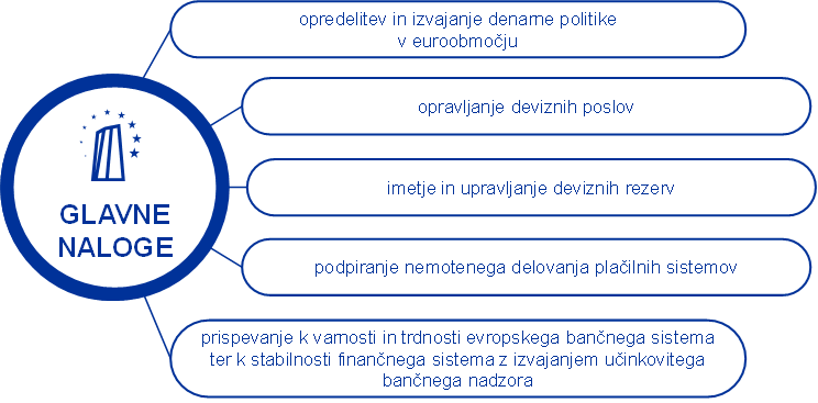 ECB je del Eurosistema, ki poleg ECB obsega še nacionalne centralne banke držav članic Evropske unije, katerih valuta je euro.[3] Poglavitni cilj Eurosistema je ohranjati stabilnost cen. ECB svoje naloge opravlja tako, kot je opisano v Pogodbi o delovanju Evropske unije[4] ter v Statutu Evropskega sistema centralnih bank in Evropske centralne banke (Statut ESCB)[5] (slika 1). ECB svoje dejavnosti izvaja z namenom izpolnjevanja svojega mandata in ne z namenom ustvarjanja dobička.