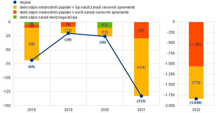 Nerealizirani dobiček iz naslova zlata in tujih valut ter nerealizirani dobiček od vrednostnih papirjev, ki se cenovno prevrednotijo, se v izkazu poslovnega izida ne prizna kot prihodek, temveč se evidentira neposredno na računih prevrednotenja, ki so v bilanci stanja ECB prikazani na strani obveznosti. Stanja na teh računih je mogoče uporabiti za nevtraliziranje učinka prihodnjih neugodnih gibanj cen oziroma tečajev, zato krepijo odpornost ECB proti osnovnim tveganjem. Leta 2022 se je vrednost računov prevrednotenja za zlato, tuje valute in vrednostne papirje[14] povečala za 3,0 milijarde EUR na 36,1 milijarde EUR, in sicer zaradi višjega stanja na računu prevrednotenja tujih valut in zlata kot rezultat apreciacije ameriškega dolarja do eura in zvišanja tržne cene zlata, izražene v eurih (graf 12), kar se je deloma izravnalo z zmanjšanjem stanja na računu prevrednotenja vrednostnih papirjev.