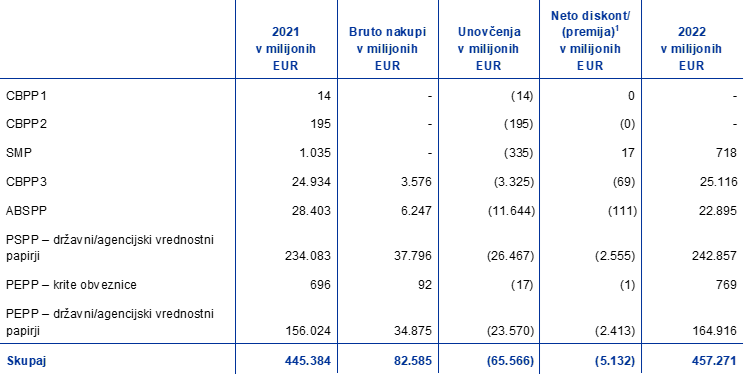 ECB je na podlagi sklepov Sveta ECB nadaljevala izvajanje neto nakupov vrednostnih papirjev v okviru izrednega programa ob pandemiji do konca marca 2022, medtem ko so se neto nakupi v okviru programa nakupa vrednostnih papirjev končali 1. julija 2022. Obenem se je glavnica zapadlih vrednostnih papirjev v obeh portfeljih med letom še naprej v celoti ponovno investirala. Zaradi teh nakupov in ponovnega investiranja se je portfelj vrednostnih papirjev, ki jih ima ECB za namene denarne politike, povečal za 11,9 milijarde EUR na 457,3 milijarde EUR (graf 2), pri čemer so se imetja v okviru izrednega programa ob pandemiji in programa nakupa vrednostnih papirjev javnega sektorja povečala za 9,0 milijarde EUR oziroma za 8,8 milijarde EUR. Imetja v okviru programa nakupa listinjenih vrednostnih papirjev so se zmanjšala za 5,5 milijarde EUR zaradi unovčenja vrednostnih papirjev.