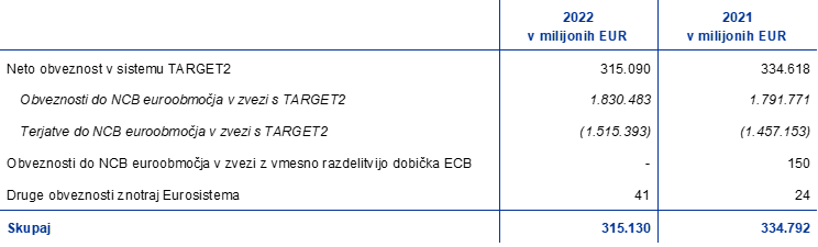 Obveznosti ECB znotraj Eurosistema, ki obsegajo predvsem neto stanje nacionalnih centralnih bank euroobmočja v sistemu TARGET2 v razmerju do ECB in obveznosti ECB v zvezi z deviznimi rezervami, ki so jih nacionalne centralne banke euroobmočja ob vstopu v Eurosistem prenesle na ECB, so se leta 2022 zmanjšale za 19,7 milijarde EUR na 355,5 milijarde EUR.