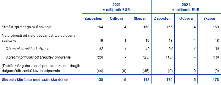 V stebru z določenimi zaslužki so izkazani samo obvezni prispevki ECB in zaposlenih. Prostovoljni prispevki zaposlenih v steber z določenimi prispevki so v letu 2022 znašali 189 milijonov EUR (2021: 220 milijonov EUR). Ti prispevki se investirajo v sredstva programa in zaradi njih nastane obveza v enaki vrednosti.