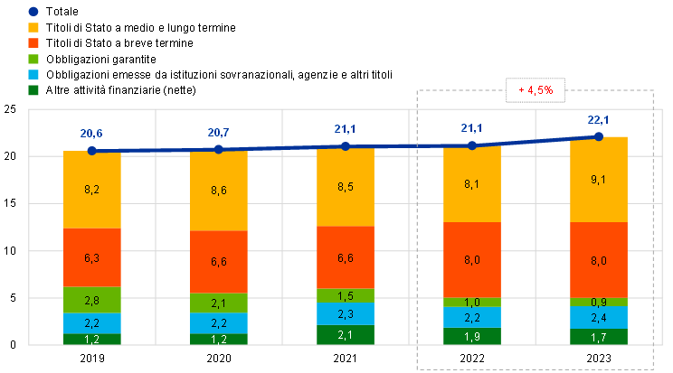 Nel 2023 lo stato patrimoniale della BCE ammonta a 674,5 miliardi di euro, evidenziando una diminuzione di 24,4 miliardi di euro principalmente dovuta alla graduale riduzione del portafoglio del PAA a seguito dei reinvestimenti solo parziali del capitale rimborsato sui titoli in scadenza tra marzo e giugno 2023 e della loro completa cessazione a luglio 2023.