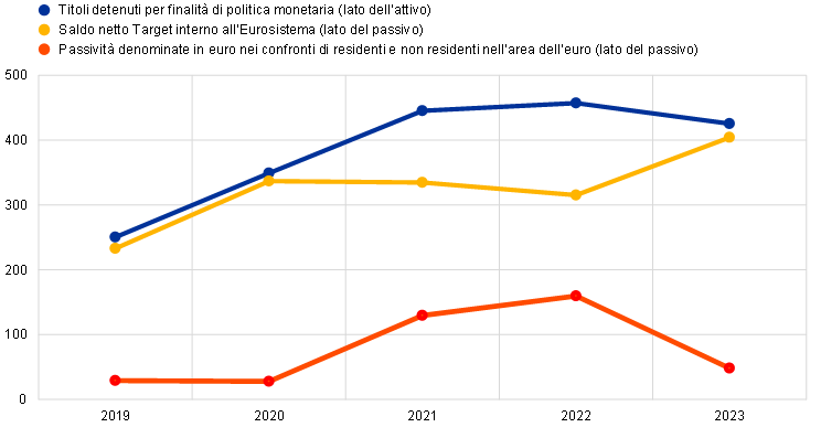 Saldo netto Target interno all’Eurosistema, passività denominate in euro nei confronti di residenti e non residenti nell’area dell’euro e titoli detenuti per finalità di politica monetaria
